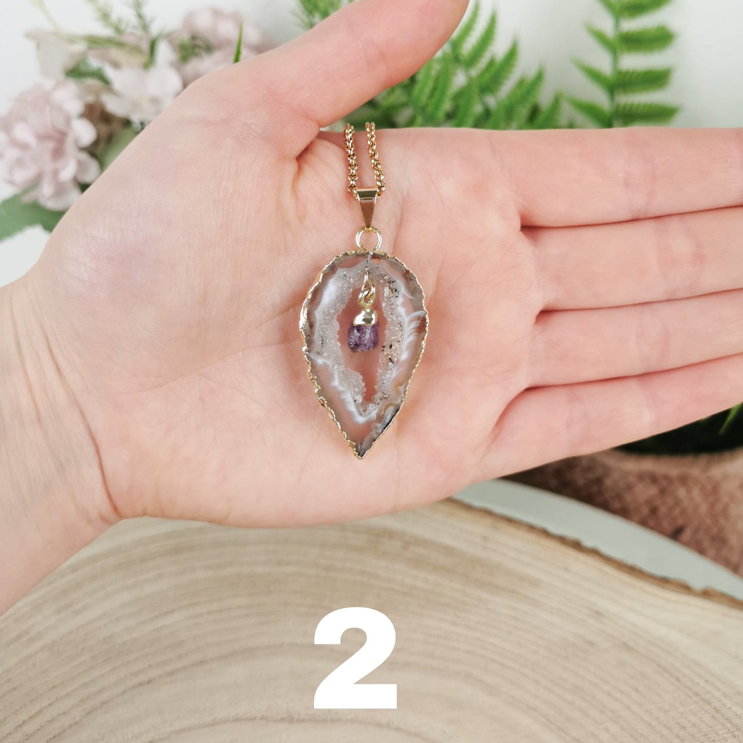 Du bekommst eine liebevoll gestaltete Kette aus Achat in gold. In dem Achat Anhänger befindet sich ein kleiner Amethyst Anhänger. Der Achat Anhänger ist ca. 4,5-5 cm groß und auf einer goldenen Kette aus Edelstahl aufgezogen. Die Länge der Kette ist verstellbar. Die Kette ist ca. 45 cm lang und hat eine 5 cm lange Verlängerungskette, sodass du die Länge bis zu 50 cm einstellen kannst.